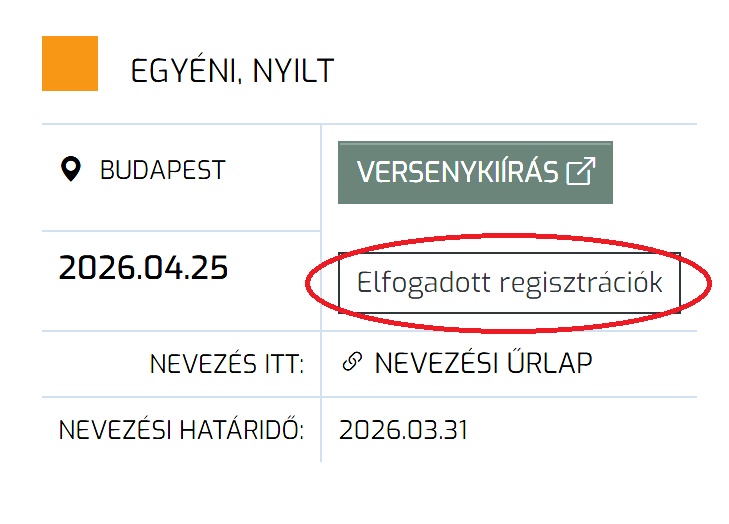 | Verseny | Helyszín | Időpont | Nevezési határidő | Versenykiírás | Nevezés | Megjegyzés |
