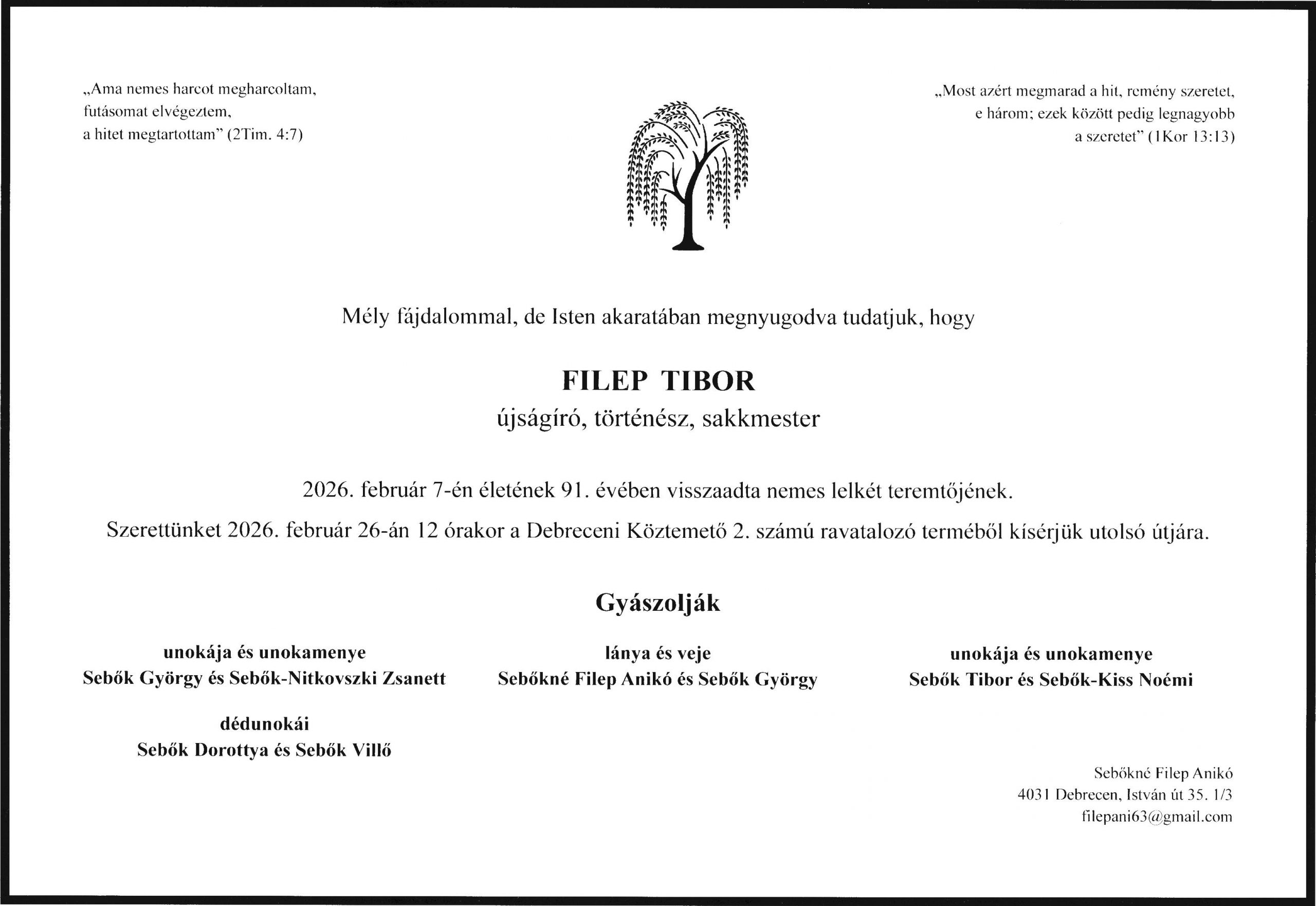 Filep Tibor sakkmester Debrecen örökös sakkbajnoka 2026. február 7-én elhunyt.