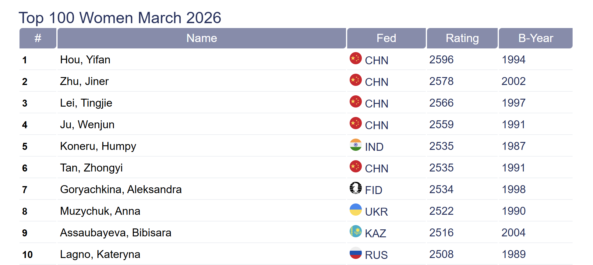 A FIDE márciusi világranglistáján a múlt hónaphoz képest Rapport (16.) és Lékó (44.) is tartja a pozícióját, míg Gledura négy helyet javítva a 62. helyre lépett előre. Az élmezőnyben a legfőbb változás az üzbég Abdusattorovnak köszönhető, aki azzal, hogy megnyerte a Tata Steel tornát, betört a top 10-be, és jelenleg az 5. helyen áll. A junior fiúknál hosszú idő után először van magyar a legjobb száz között, és rögtön kettő is: Palczert Mátyás 2466 Élő-pontjával a 83., Bodrogi Bendegúz 2457-tel a 98.
